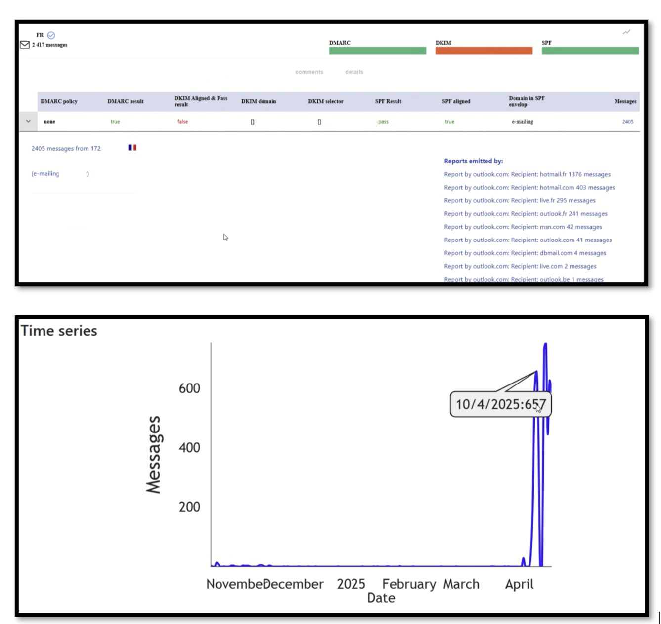 Analyzes DMARC aggregate and forensic reports to identify email authentication issues.
